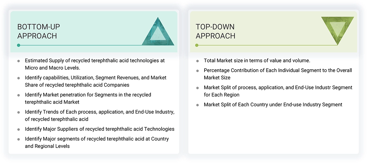 The study involved four major activities in estimating the market size of the recycled terephthalic acids market. Exhaustive secondary research was done to collect information on the market, the peer market, and the parent market. The next step was to validate these findings, assumptions, and sizing with industry experts across the value chain through primary research. Both top-down and bottom-up approaches were employed to estimate the complete market size. Thereafter, the market breakdown and data triangulation procedures were used to estimate the market size of the segments and subsegments.