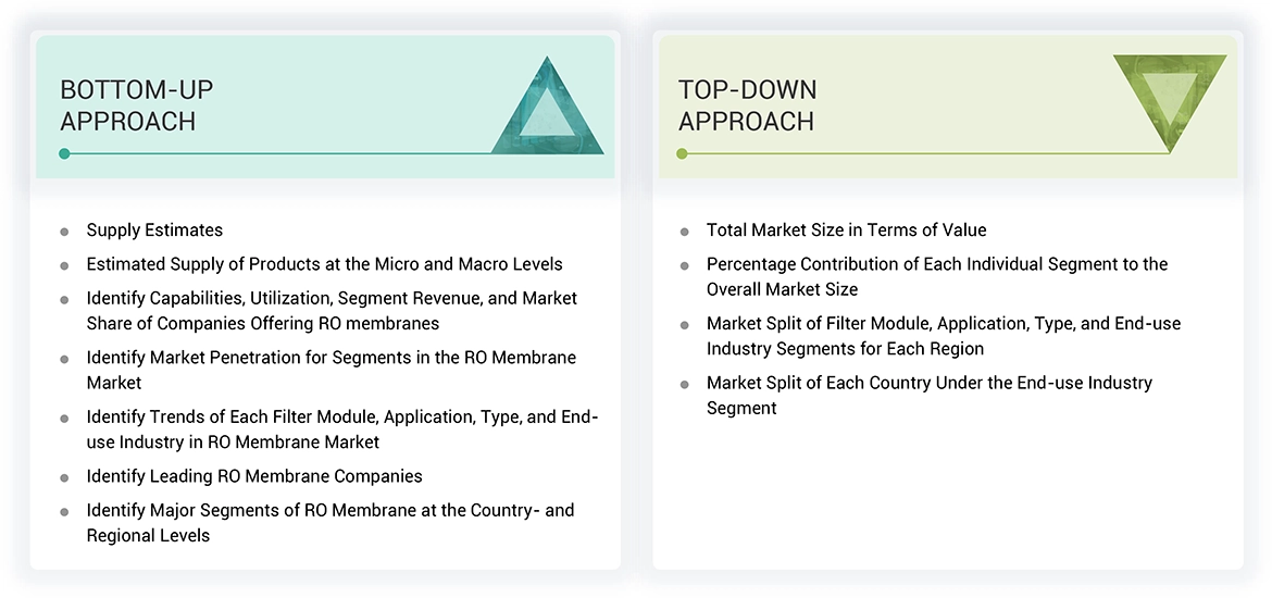 The study involved four major activities in estimating the market size of the RO membrane market. Exhaustive secondary research was done to collect information on the market, the peer market, and the grandparent market. The next step was to validate these findings, assumptions, and sizing with industry experts across the value chain through primary research. Both top-down and bottom-up approaches were employed to estimate the complete market size. Thereafter, the market breakdown and data triangulation procedures were used to estimate the market size of the segments and subsegments.