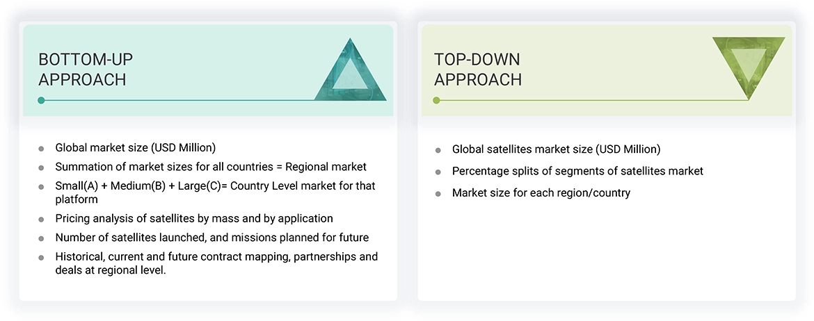 After arriving at the overall size of the satellites market from the market size estimation process explained above, the total market was split into several segments and subsegments. The data triangulation and market breakdown procedures explained below were implemented, wherever applicable, to complete the overall market engineering process and arrive at the exact statistics for various segments and sub-segments of the market. The data was triangulated by studying various factors and trends from both the demand and supply sides. The market size was validated using both top-down and bottom-up approaches.
