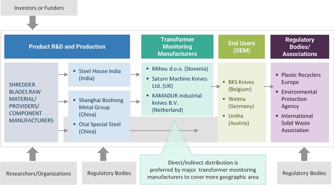 The shredder blades market comprises several stakeholders such as shredder blades manufacturers, manufacturers of subcomponents of transformer monitoring, manufacturing technology providers, and technology support providers in the supply chain. The demand side of this market is characterized by the rising demand for waste management and recycling companies that utilize shredder machines to meet their sustainability requirements are categorized as end users.