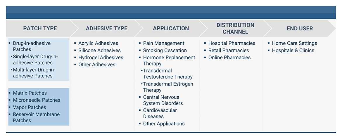 To describe, analyze, and forecast the transdermal patches market, by patch type, adhesive type, application, distribution channel, end user and region.