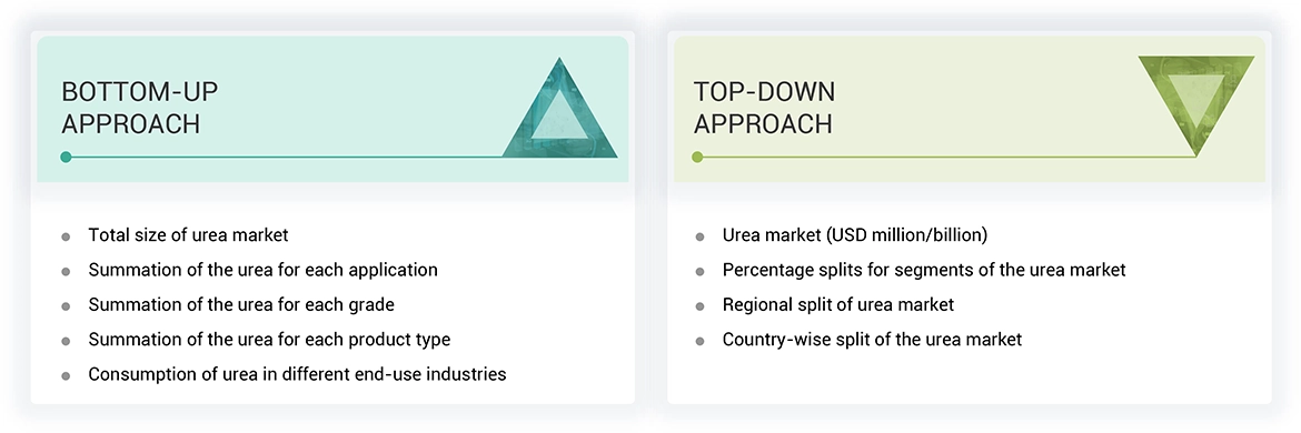 The study involved four major activities for estimating the current size of the global urea market. Exhaustive secondary research was conducted to collect information on the market, the peer product market, and the parent product group market. The next step was to validate these findings, assumptions, and sizes with the industry experts across the value chain of urea through primary research. Both the top-down and bottom-up approaches were employed to estimate the overall size of the urea market. After that, market breakdown and data triangulation procedures were used to determine the size of different segments and sub-segments of the market.