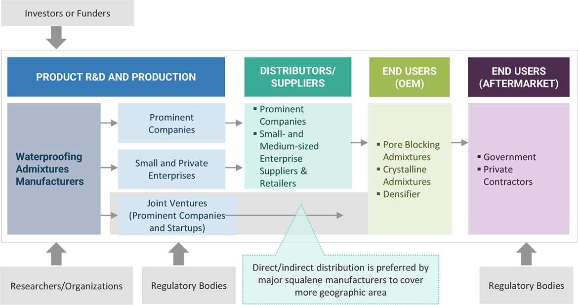 The waterproofing admixtures market comprises several stakeholders, such as raw material suppliers, end-product manufacturers, and regulatory organizations in the supply chain. The demand side of this market is characterized by the pore blocking admixtures, crystalline admixtures, and densifiers. The supply side is characterized by advancements in technology and diverse application industries. Various primary sources from both the supply and demand sides of the market were interviewed to obtain qualitative and quantitative information.