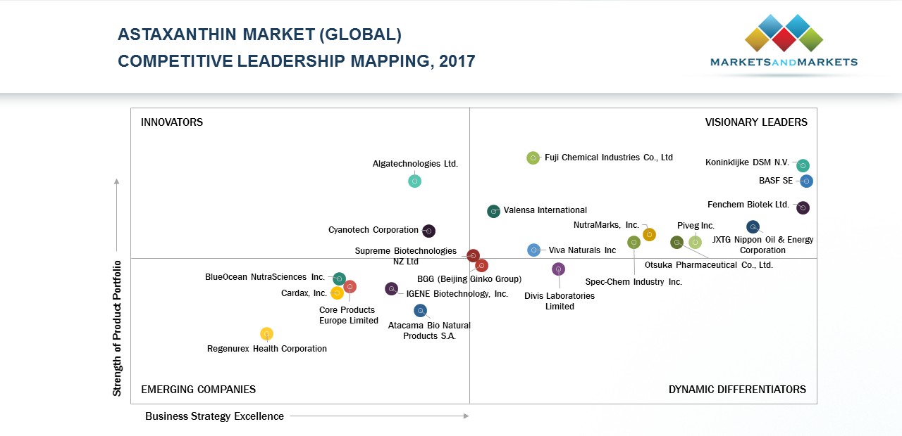 DSM, BASF, Fenchem Biotek, JX Nippon Oil & Energy, Otsuka Pharmaceutical, Piveg, Nutramarks, SpecChem Industry, Valensa International, and Fuji Chemical Industries have been identified as the Visionary Leaders in the Astaxanthin Market – Competitive Leadership Mapping