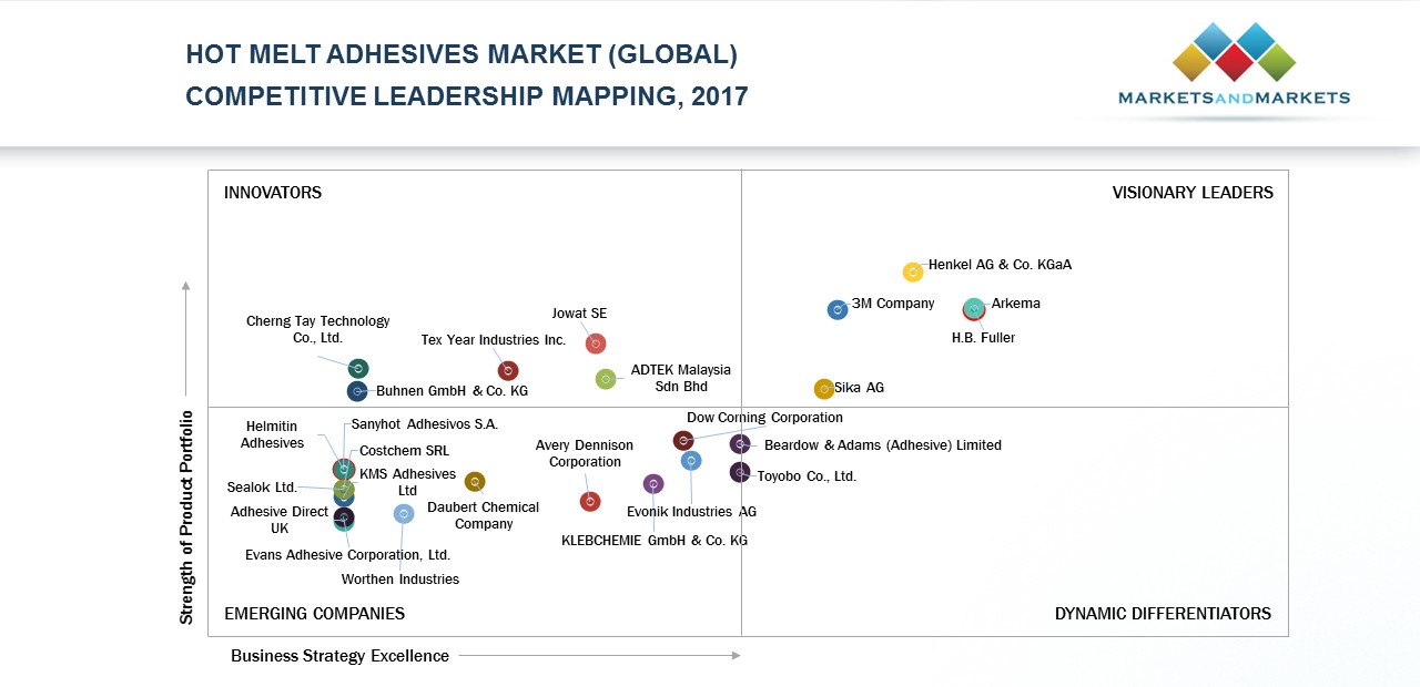 Arkema, H.B. Fuller, Henkel, 3M, and Sika have been identified as the Visionary Leaders in the Hot Melt Adhesives Market – Competitive Leadership Mapping