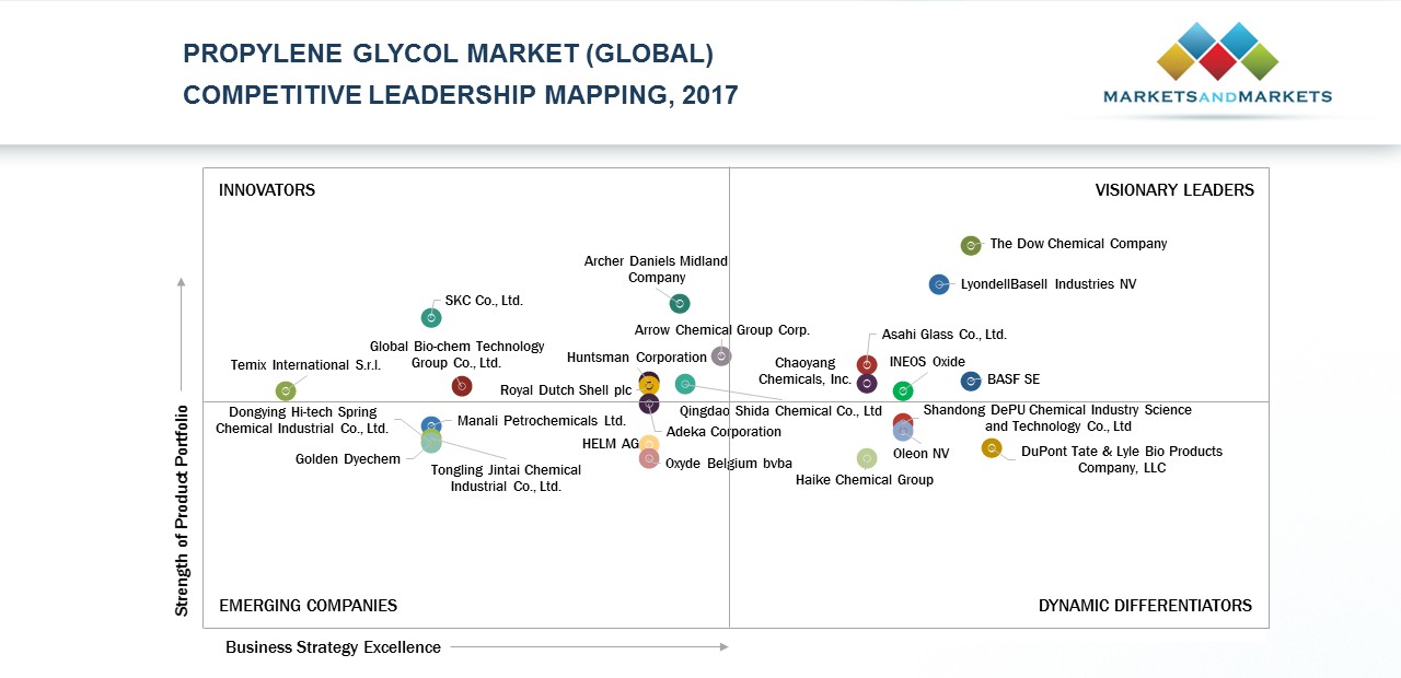 Dow, Lyondell Basell, BASF, Ineos Oxide, Asahi Glass, and Chaoyang Chemicals have been identified as the Visionary Leaders in the Propylene Glycol Market – Competitive Leadership Mapping