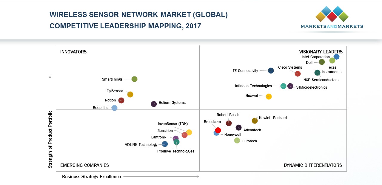 Cisco Systems, Dell, Huawei, Infineon Technologies, Intel Corporation, NXP Semiconductors, STMicroelectronics, TE Connectivity and Texas Instruments have been identified as the Visionary Leaders in the Wireless Sensor Network Market – Competitive Leadership Mapping