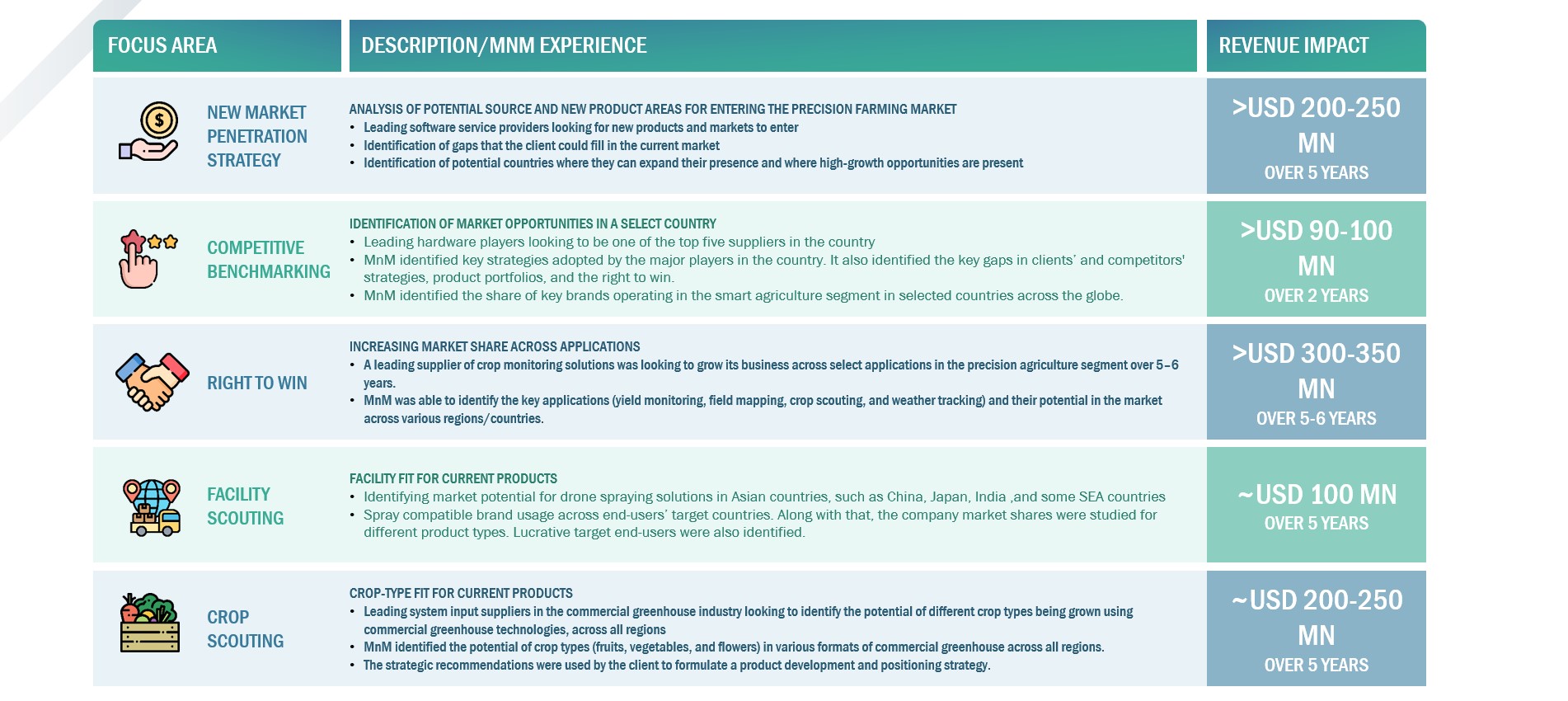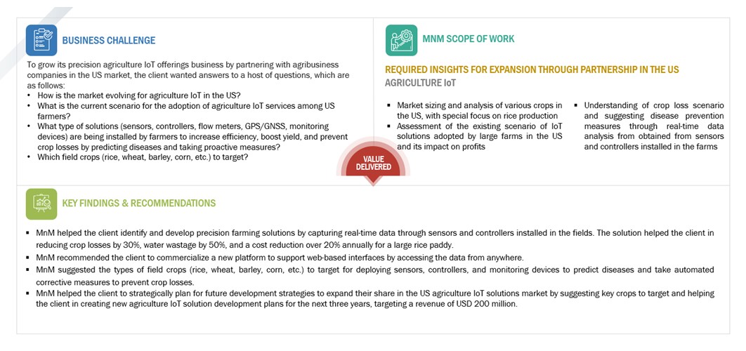 FOR A LEADING AG-TECH SOLUTIONS PROVIDER - MNM HELPED THE CLIENT PARTNER WITH AGRIBUSINESS COMPANIES TARGETING A PROJECTED REVENUE OF USD 200 MILLION IN THREE YEARS FROM AGRICULTURE IOT SOLUTIONS