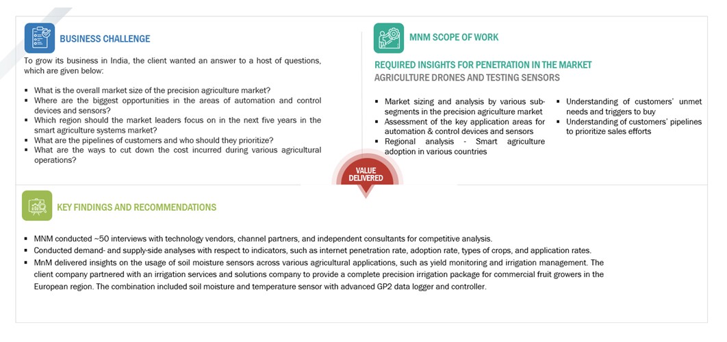 FOR AN AGRICULTURE SENSORS MANUFACTURER IN HORTICULTURAL CROPS - MNM HELPED THE CLIENT TO PENETRATE THE MARKET WITH A PROJECTED REVENUE GENERATION OF USD 30 MILLION OVER A YEAR