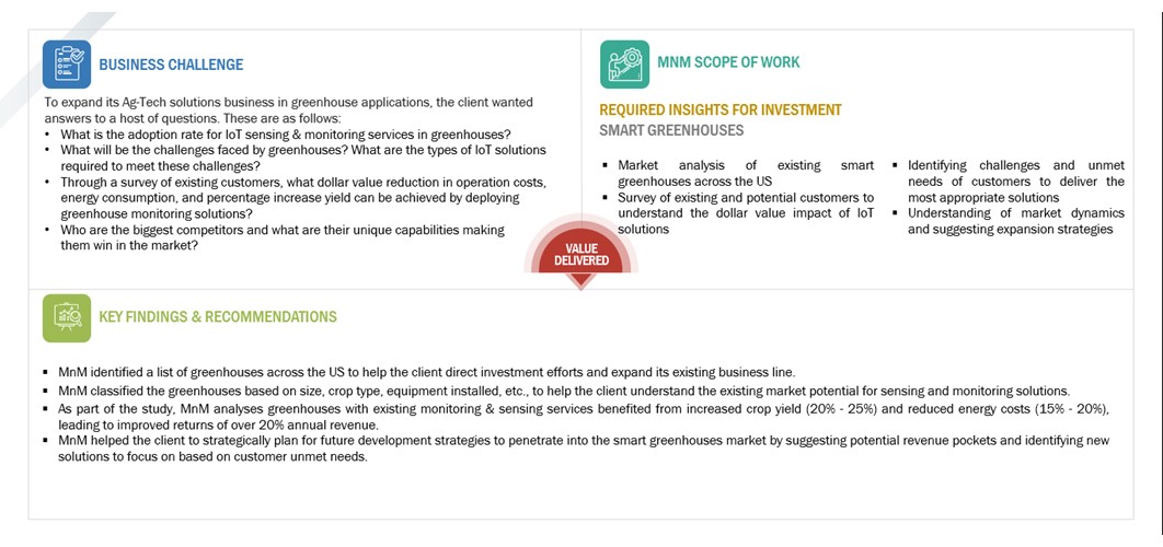 FOR A LEADING PROVIDER OF AG-EQUIPMENT - MNM HELPED THE CLIENT INVEST IN A SMART GREENHOUSE SOLUTION PROVIDING START-UP WITH REVENUE GROWTH PROSPECTS OF USD 50 MILLION OVER THREE YEARS